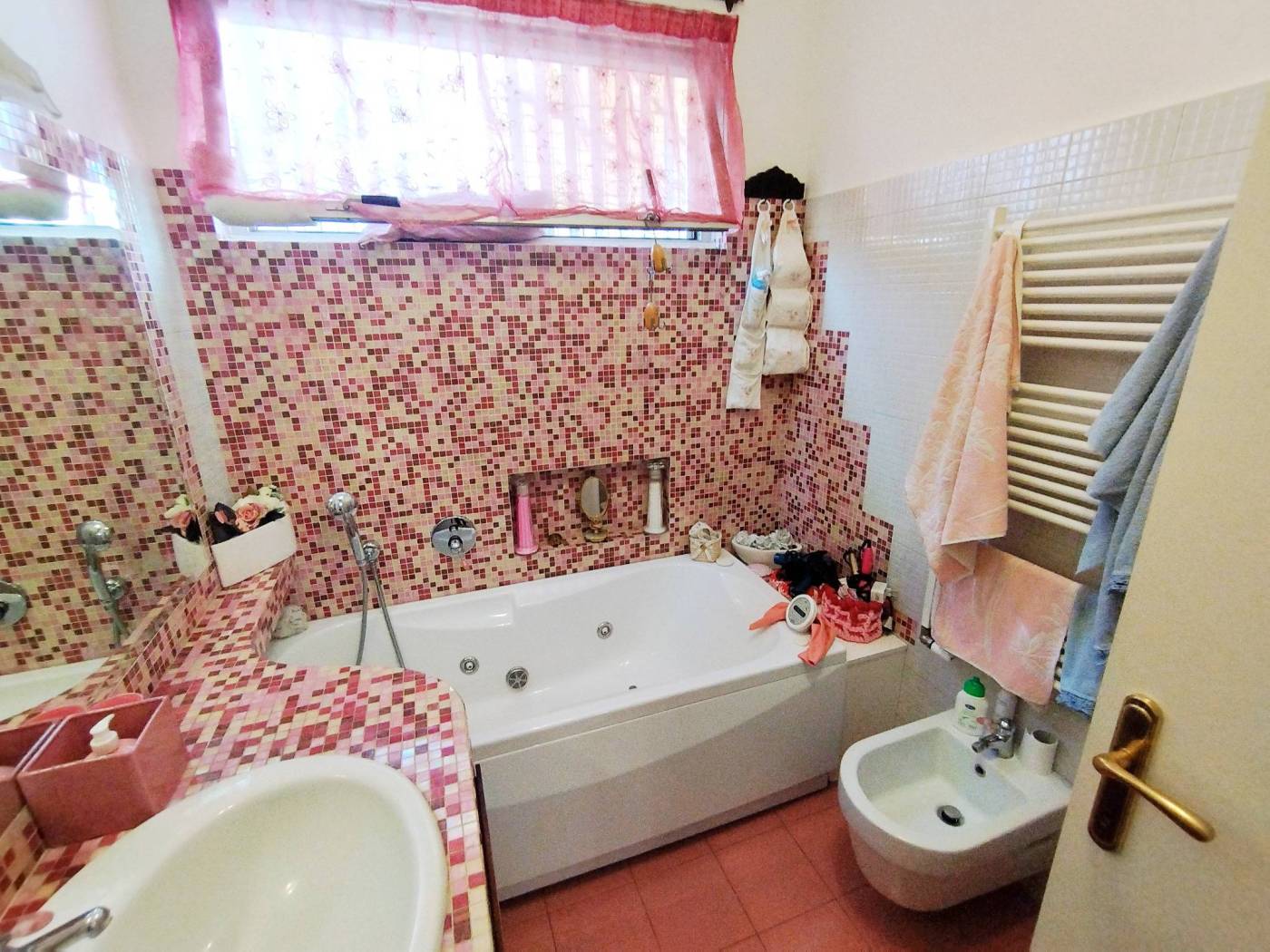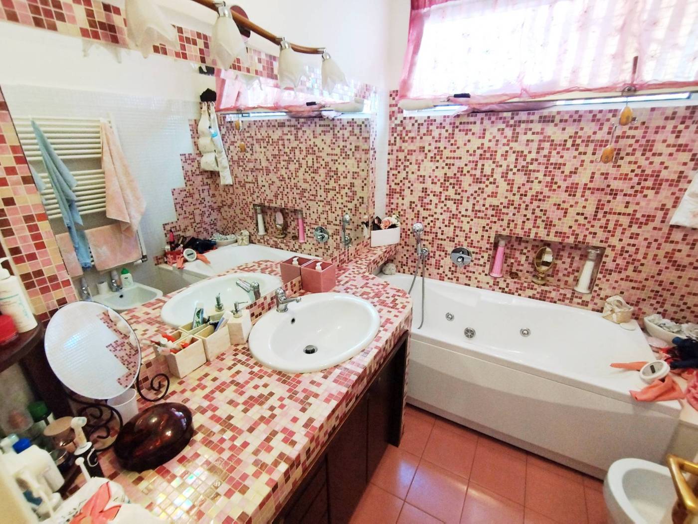 bagno padronale finestrato con vasca idromassaggio Novellini, sanitari sospesi e lavabo in muratura;