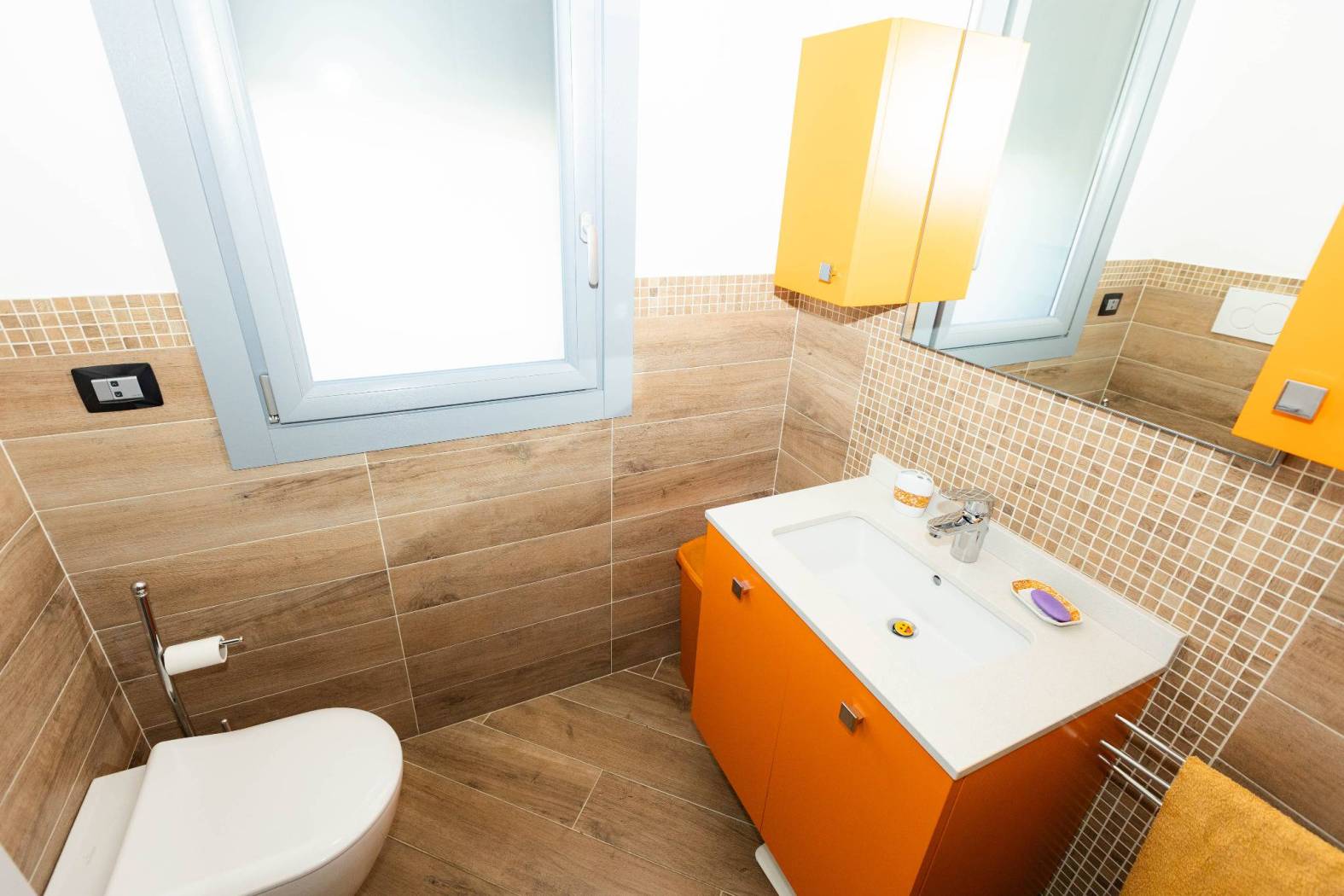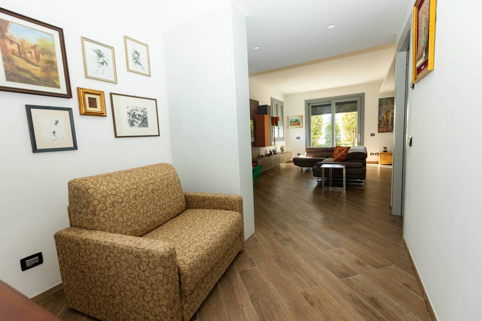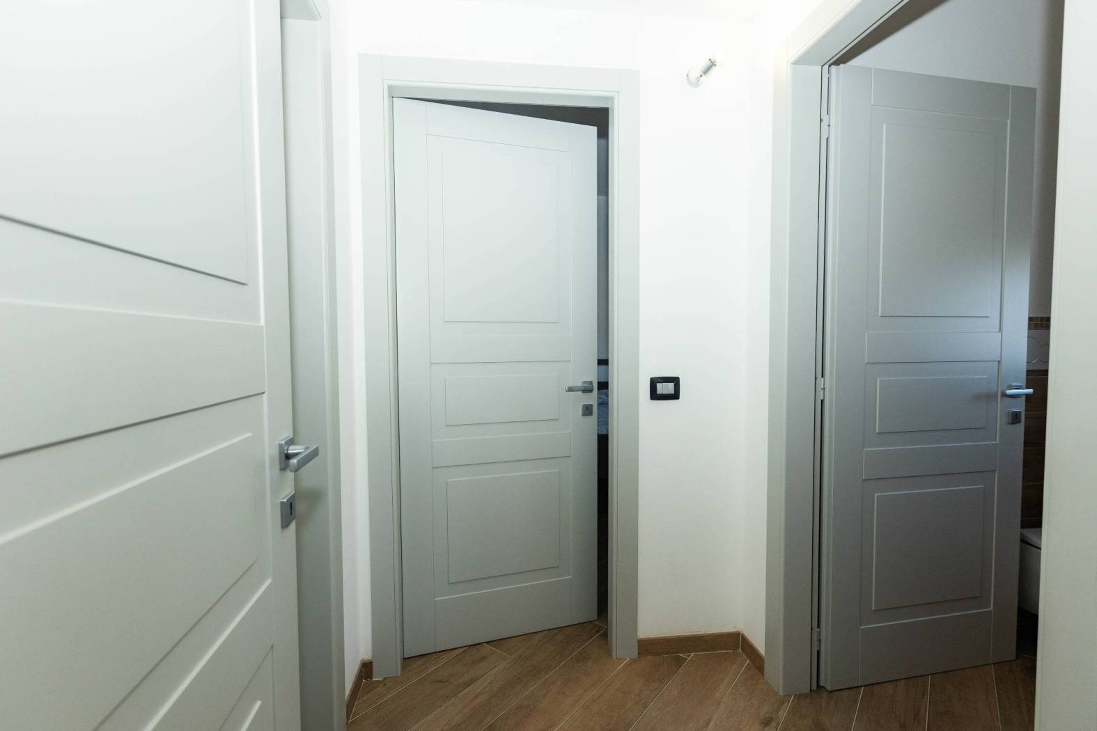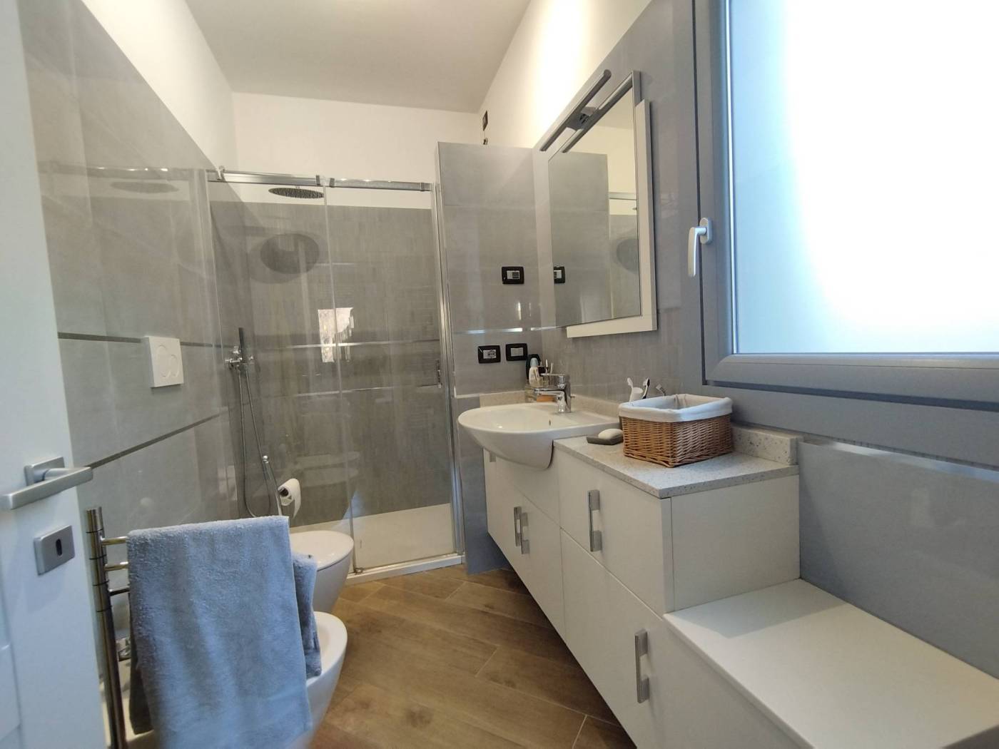 Pavimenti in gres porcellanato effetto legno, zanzariere, contatori individuali per ogni ambiente.